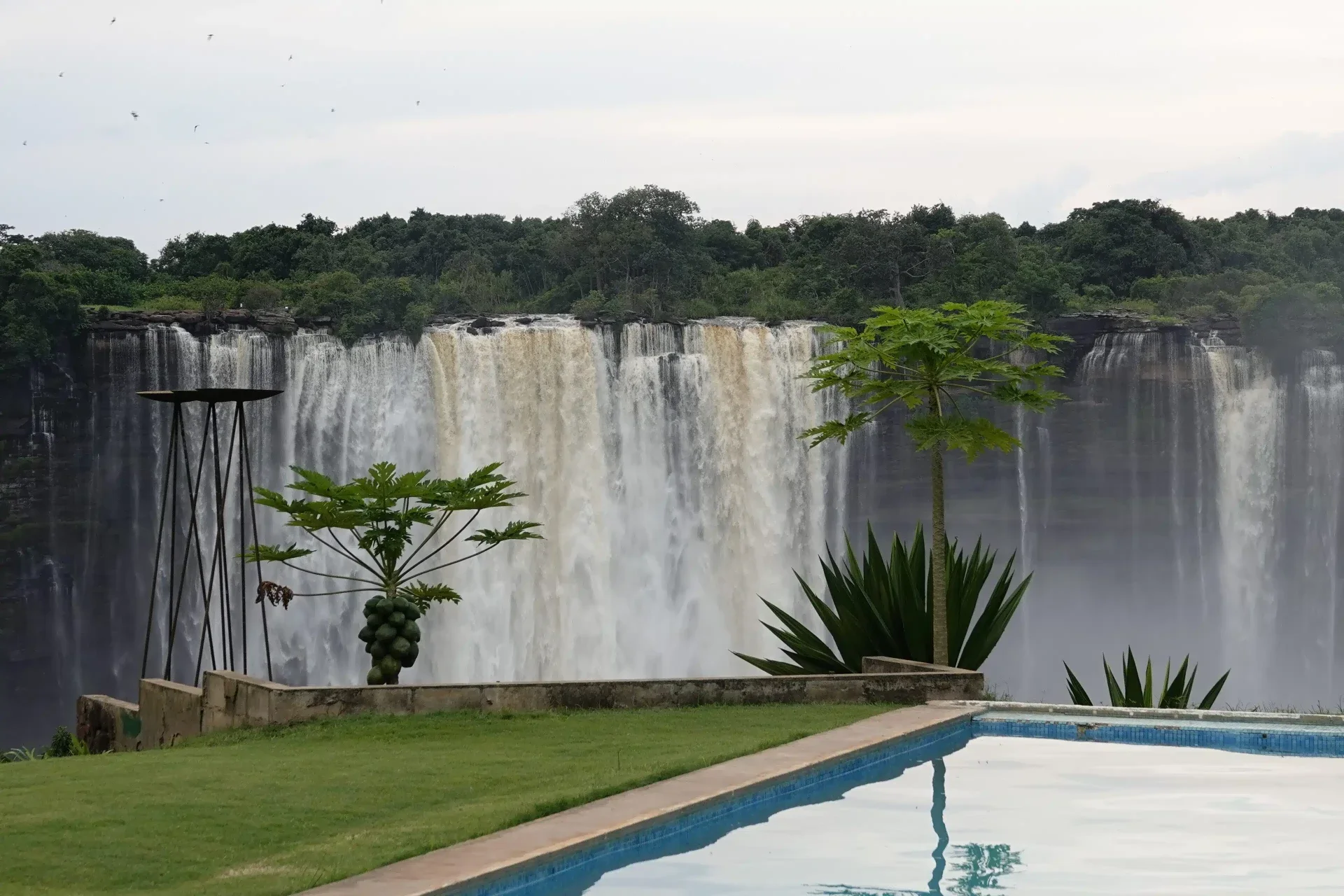 Op een fantastisch uitzichtpunt is een hotel gebouwd, waar we op het parkeerterrein mogen overnachten. Voor een habbekrats kunnen we gebruik maken van de sanitaire voorzieningen in een hotelkamer en gebruik maken van het prachtige zwembad vanwaar we de watervallen in het zicht houden. We maken een wandeling door dichte begroeiing, over rotsen langs de bovenkant van de waterval. We zien er veel speciale plekken met prachtige uitzichten. Ook kunnen we hier badderen in de “natuurlijke zwembaden”. De meeste mensen blijven bij het hotel en nemen niet de moeite hier even te kijken, terwijl het ons even “de gelukkigste mensen op aarde” maakt.