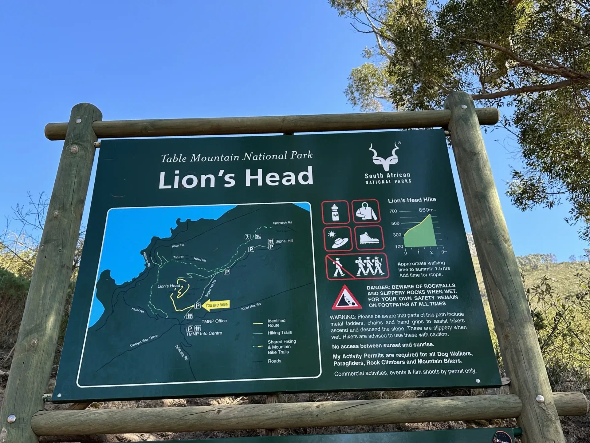 Als eerste maken we, nabij Kaapstad, een wandeltocht naar de Lionshead, een prachtige bergtop die een mooi overzicht over de stad geeft. De wandeling start op zo’n 300 meter en de top bevindt zich op 669 meter. Het eerste deel van de klim is redelijk makkelijk, maar bij het laatste stuk wordt het toch echt handen- en voetenwerk over de rotsen. Hier en dier een kabel en wat trappen helpen ons bij de steilste stukken.