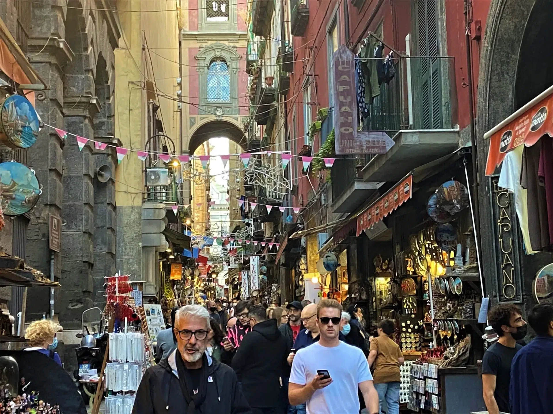 Vanaf de camping in het voorstadje Arcolano nemen we de trein naar het hoofdstation van Napoli en vervolgens de metro naar het metrostation Toledo. De reis is al een ervaring op zich. Op stations en in treinen zie je al zoveel van de omgeving en de leefgewoonten van mensen. Een aantal keren wordt ons spontaan de weg gewezen door Napolianen die zien dat we zoekende zijn. Achter de Via Toledo is de volkswijk Spagnoli gelegen. We lopen hier rond en zijn diep onder de indruk van de gezellige en gemoedelijke sfeer. Barretjes, terrasjes, toeterende scooters en chaos in nauwe straatjes waar het lijkt of de was permanent buiten hangt. We pakken regelmatig een terrasje en genieten van alles wat er om ons heen gebeurt.