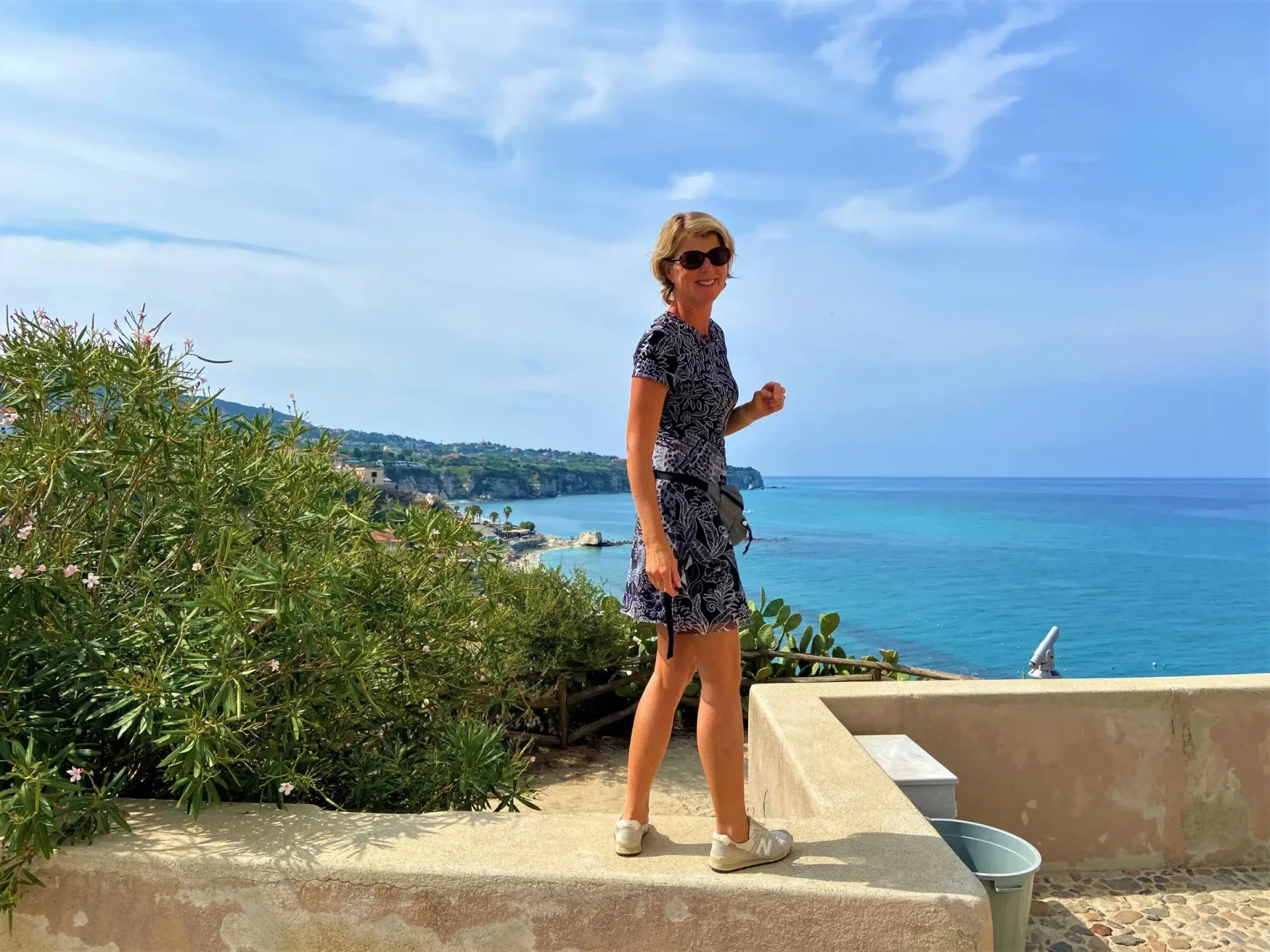 Bovendien is hij erg enthousiast over onze camper en wil graag even achter het stuur zitten. Wij besluiten een kijkje in Tropea te nemen. Het blijkt een indrukwekkend dorpje te zijn, gelegen op een 60 meter hoge rots. Net vóór de kust -en dus vóór het dorpje- torent een kalksteen-rots boven de zeespiegel uit met daar bovenop een kasteel. Tegen de kust is het zandstrand schoon en aantrekkelijk.