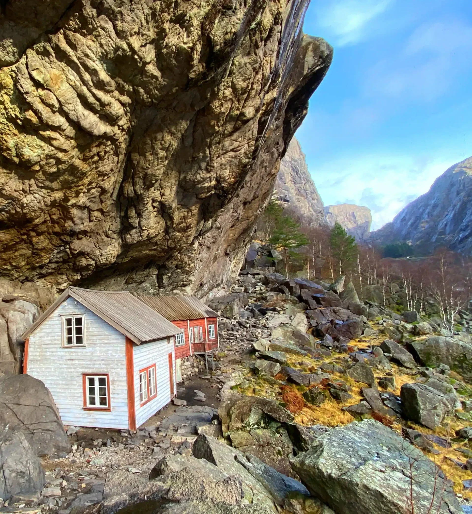 Een mooie attractie vormen de twee historische huisjes die onder een enorme overhangende rots staan.