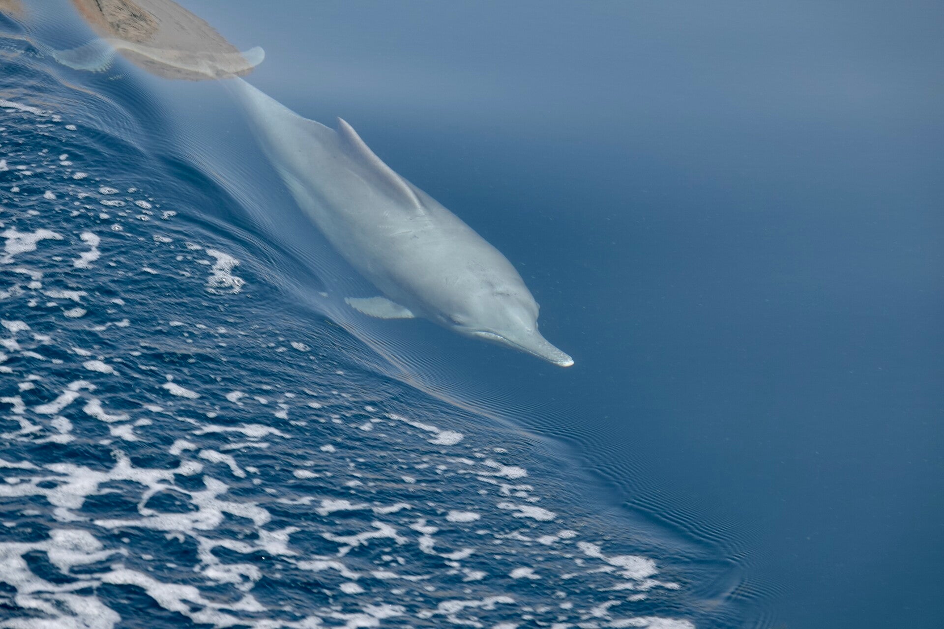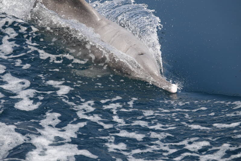Na een uur varen gebeurt waar we op hoopten: dolfijnen. Twee dieren zwemmen speels met ons mee, dan weer links van de boot, dan weer rechts. Wat is dit bijzonder. Dit keer slagen we erin redelijke opnames te maken, zodat we nog lang kunnen nagenieten.