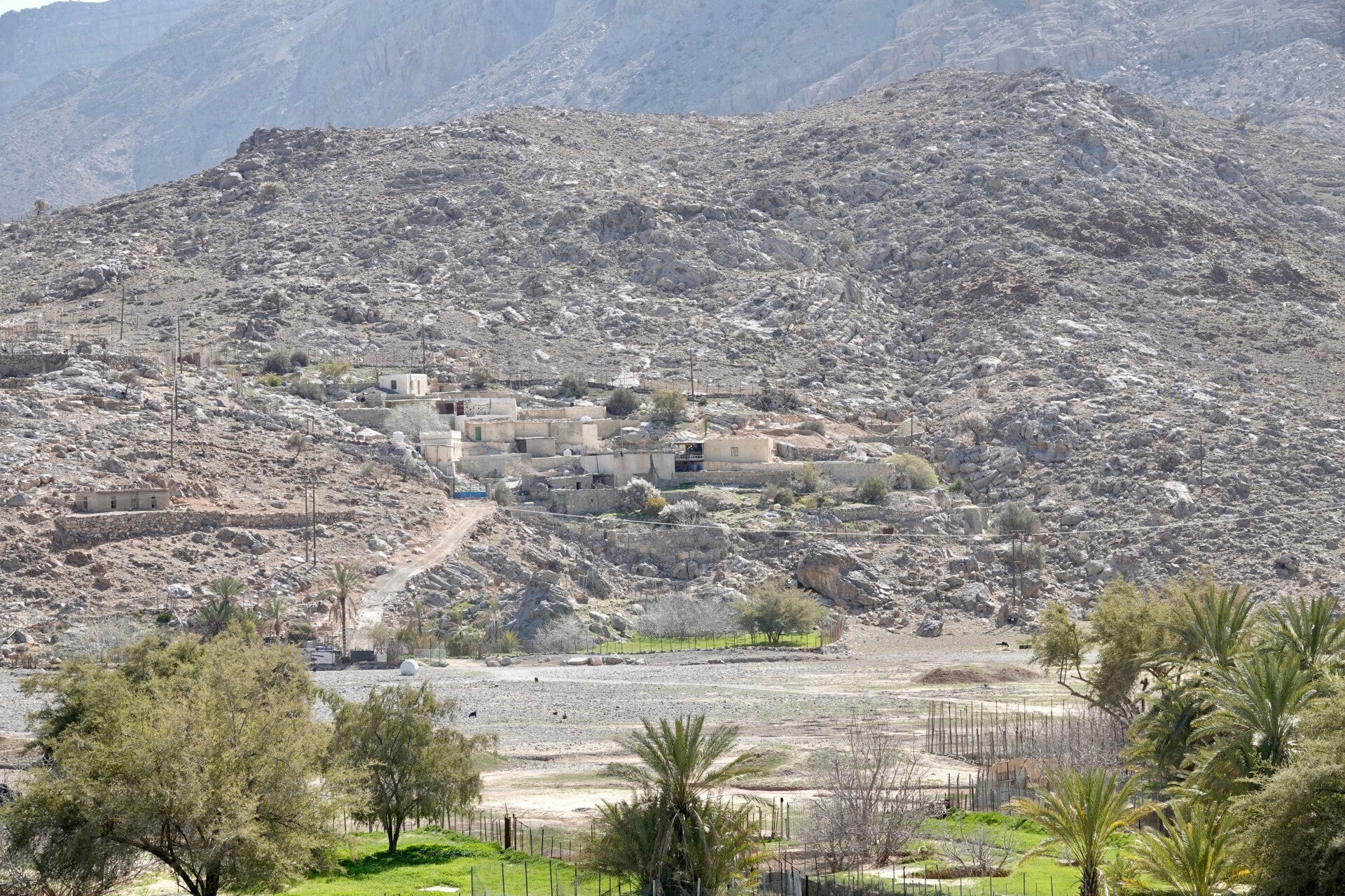 We hebben een heerlijk ontspannen plekje, met een paar gemoedelijk grazende ezels om ons heen, terwijl we van ons ontbijtje genieten voordat we aan de klim beginnen. Wat hoogtemeters en afstand betreft is het niet bijzonder uitdagend: een kleine tien kilometer retour en zo’n 400 hoogtemeters. Het pad zelf is wel ruig. Ooit aangelegd voor het plaatsen van hoogspanningsmasten, maar inmiddels grotendeels geërodeerd. Het laatste stuk loopt pal langs de grens met de Verenigde Arabische Emiraten. We zien meerdere grenspalen staan. Nog een klein stukje verder bereiken we het hoogste punt van onze wandeling. Vanaf hier hebben we een fantastisch uitzicht over het dal onder ons.